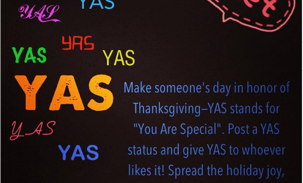 Our Thanksgiving YAS project was a success! We had at least seven people share the YAS status, and over 90 YAS posts within the few days the project was active. Good job to everyone who posted a YAS status! We will do another round of YAS near the last week of December.