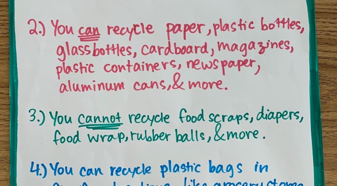 Today for Leaders UNITE at the International Preschool of Raleigh, students became leaders in recycling! The school plans to get some recycling bins soon, and today, Leaders UNITE students learned what it means to recycle. Students then created a rule list for recycling to paste in school for all of their other friends to learn about recycling. Students then made a supply list of things they want to recycle at school, so that teachers could go shopping for different types of recycling bins for their school. The first pictures shows their recycling rules list. The second picture shows the rule list alongside some of the students’ drawings of recyclables (paper, newspaper, glass bottles, recycling bins) and some animals that can be saved when we recycle!